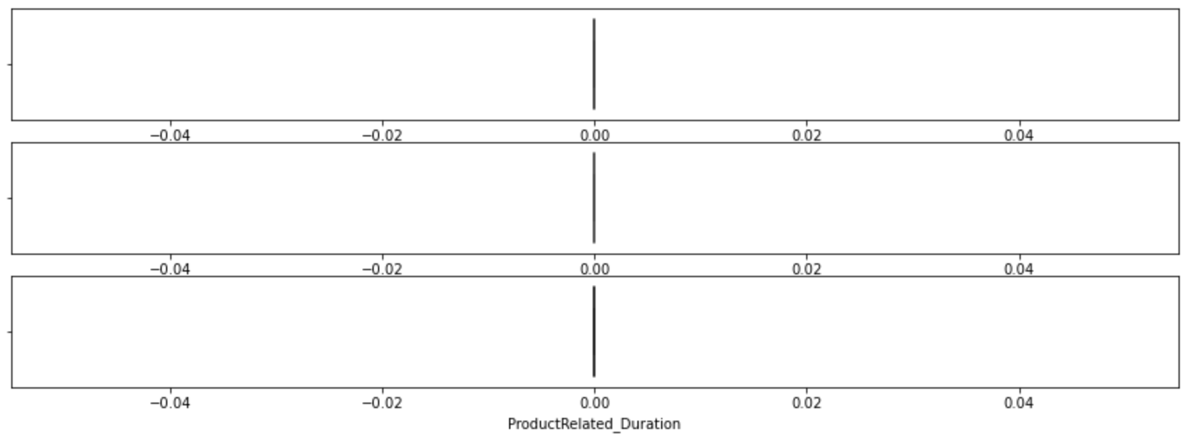 이처럼 판단한 이유는 다음과 같다. 세 가지의 변수는 한 번의 세션 동안 카테고리별 사이트에 머무는 시간과 관련된 변수이기 때문에 '그 값이 증가하면 상품의 구매로 이어질 수 있다("Revenue"='True')'라는 가설을 생각해 보았고, 통계적으로 이상치라 판단이 된다고 하더라도 그 값이 Target value를 예측하는 데에 유의미한 영향을 끼친다면 이상치로 판단하지 않는 것이 적절하다고 생각했다.