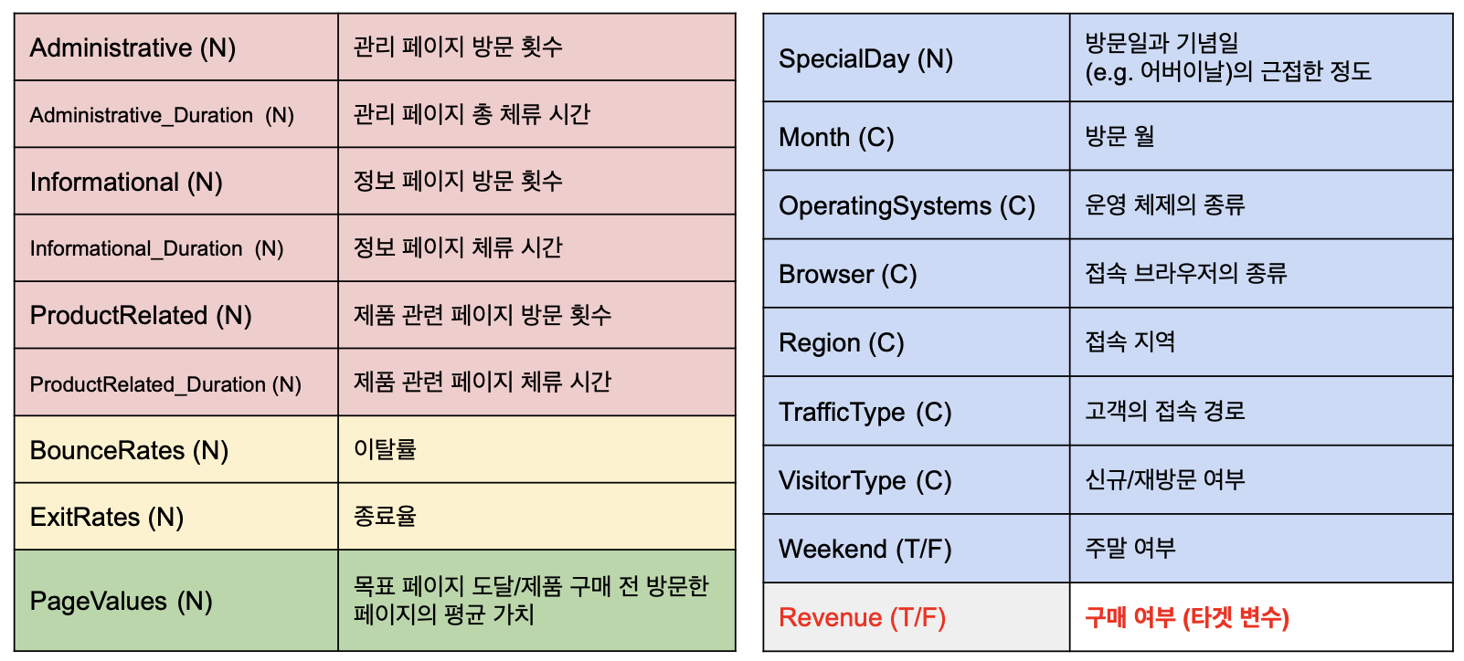 문제 정의 : 고객 데이터를 통해 구매 행위('Revenue'-구매 여부)를 예측